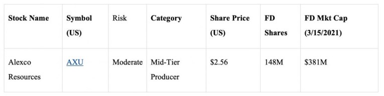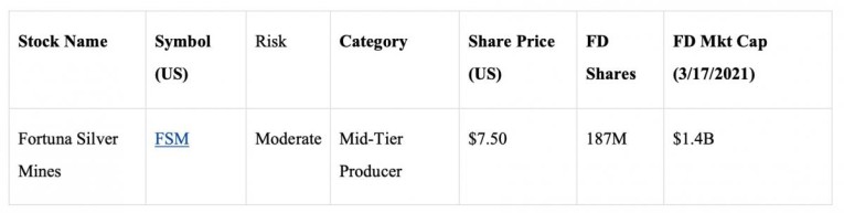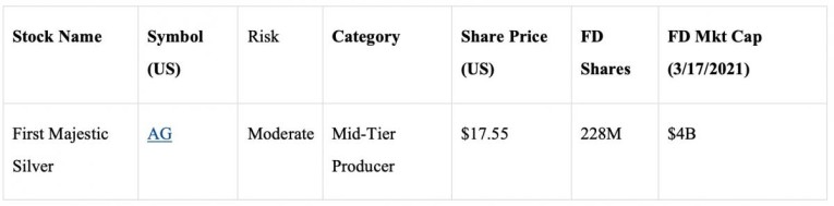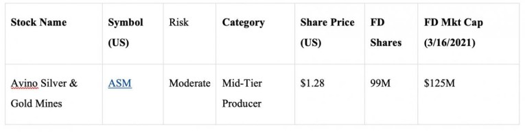 Avino Silver & Gold Mines is an emerging mid-tier silver producer in Mexico. They will produce about 2.5 million oz. of silver equivalent in 2021 with all-in costs around $19 per oz. (free cash flow). Their costs were high in 2020 due to COVID, but I expect them to come back down in 2021. We will have to keep an eye on their costs.