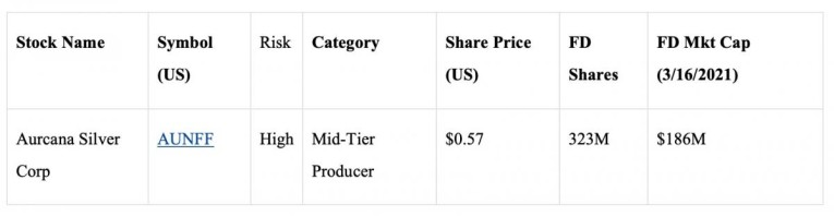Aurcana Silver Corp is scheduled to be a silver producer in Colorado in 2021 (RV Mine). They recently obtained a $28 million loan and raised money through share dilution. Production should ramp up to 3 million oz. (AGEQ) with all-in costs around $15 per oz. (probably much higher).