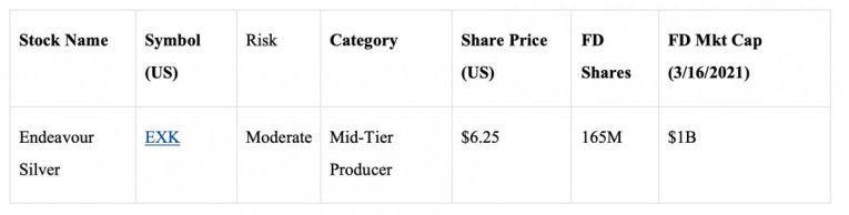 Endeavour Silver is a silver/gold producer in Mexico. They have 3 high-grade silver/gold producing mines, with expected production of 6.5 million oz. (silver equivalent including gold) in 2021. They are expanding production and reserves, projecting 9.5 million oz. (silver equivalent) by 2023. They have high cash costs ($12 per oz.) and high all-in costs (free cash flow) around $22 per oz. But their next two mines have lower cash costs and should reduce their all-in costs.