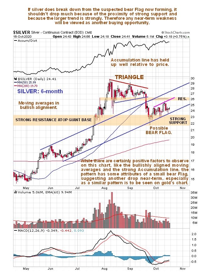 The rather sharp breakdown from the Triangle in mid-September caused some damage to sentiment and on the 6-month chart we can see that a pattern has since formed that looks like a bear Flag. If this interpretation is correct, then we can expect it to break lower again near-term, but due to the proximity of strong support, it is unlikely to drop by much—probably to somewhere between the bottom of the band of support shown and the rising 200-day moving average. This is a rather tough call because other factors are very bullish, including the strong Accumulation line which made new highs about a week ago and the bullish alignment of moving averages. What all this suggests is that we will have one last modest drop to complete this corrective phase before silver takes off strongly higher again in a second major upleg, and this fits with the scenarios set out for gold and the dollar in the parallel Gold Market update. In any event, downside here is viewed as limited and with hyperinflation looming as mentioned at the outset, any short-term dips will be viewed as presenting outstanding opportunities to build positions across the sector ahead of the new major upleg.