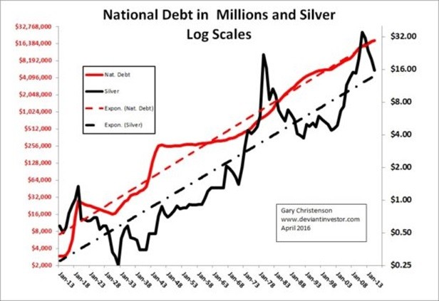 Central bankers want more debt, more currency in circulation, and mild to moderate inflation.  Politicians want to spend more, buy votes, receive payoffs, and take care of their friends.  The military wants another war.  That triumvirate of money interests, politicians, and the military practically guarantees more debt and higher prices.  Examine the following chart of US national debt (in $ millions) and average annual silver prices – both on log scales: