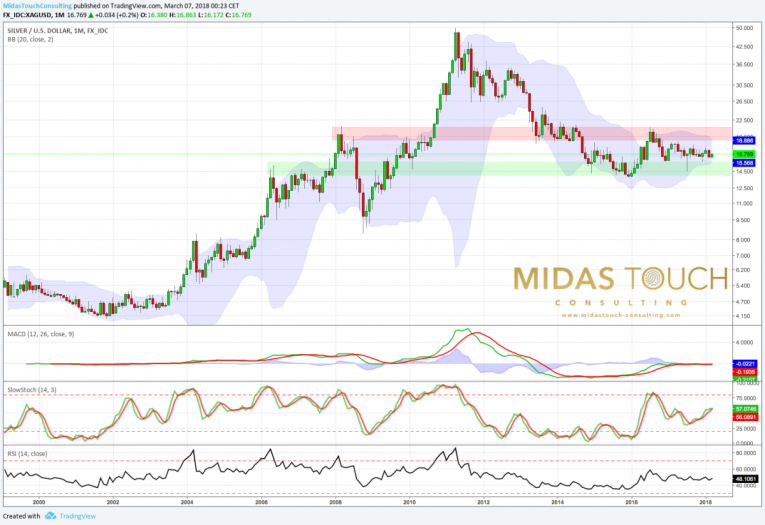 The monthly chart captures the last 18 years in the silver market. Since its top in May 2011 at 50.00 USD silver went through a long and severe correction. The final low (so far) has been reached in mid of December 2015 at 13.62 USD. From those extremely oversold levels silver posted a bounce up to 21.15 USD during the first half of 2016. This has been the last time that silver showed some strength as it has since then gone through another correction and moved into sleeping mode. Overall silver has been moving sideways between 15.50 USD and 18.50 USD during the last 4 years.