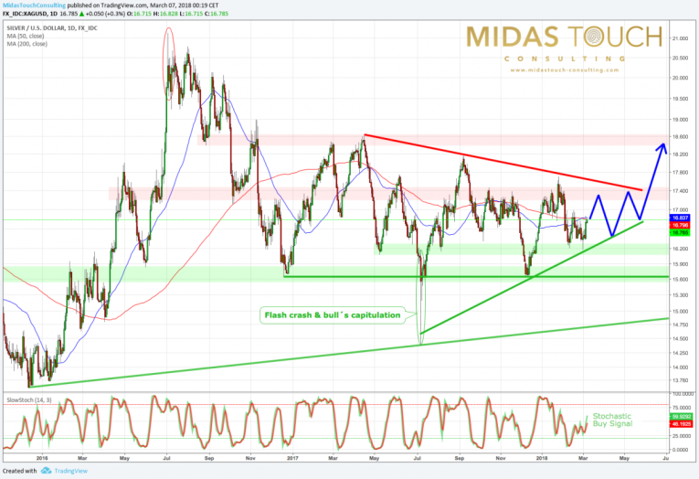 On the daily chart silver is in a downtrend since July 2016 and has posted a series of lower highs. At the same time the strong support zone above 15.50 USD has held numerous times. Only last summer when the silver market experienced a nasty flash crash prices fell below this crucial support on an intraday basis.