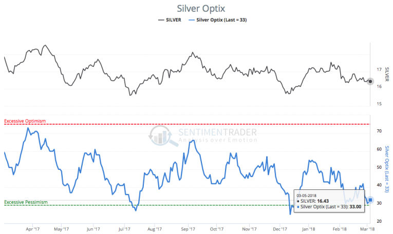 The sentiment analysis clearly shows that current mood among silver investors and traders has been close to levels of excessive pessimism and has not seen any form of high optimism since about a year now. This proves the thesis that silver is a contrarian play at the moment.