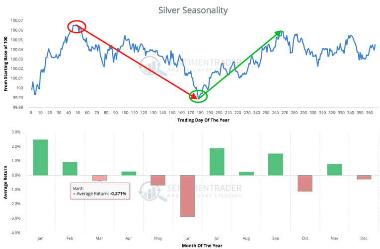 Silver has a well established seasonal cycle! Typically between mid of February until late June silver prices are often in a severe downtrend and are going through a correction. But from early July until end of September silver statistically is posting a very strong rally. Of course from the seasonal perspective it is not a good time to buy silver right here and now. But one could already start preparing and building liquidity over the next three months to catch the early summer bottom. As well seasonality doesn't have to play out exactly to the usual pattern.