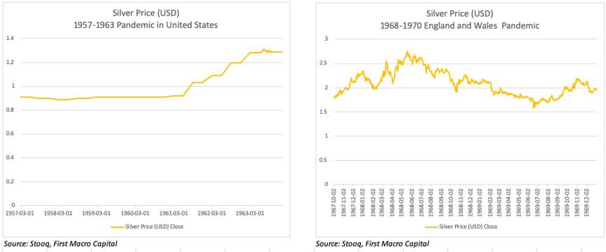 In the 1968-1970 pandemic, we saw the silver price fall initially from $2.34/oz to a low of $1.98/oz as the first wave took hold, before accelerating to a high of $2.75/oz during the summer months of 1968 before the second and final wave took hold in the winter of 1968 and in 1969. This final wave took the silver price down throughout the second wave. Silver bottomed at $1.69/oz in June of 1969. Mixed results throughout the pandemic in 1968-1970.