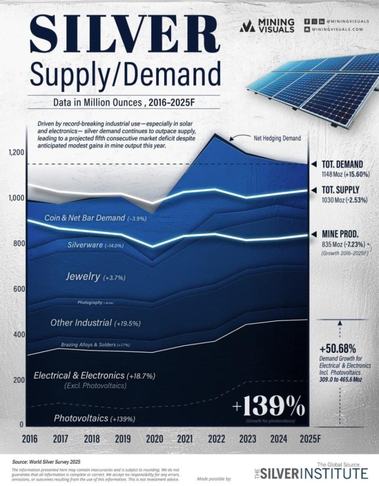 Fundamentally, according to our colleagues at the In Gold We Trust Report 2025, a fifth consecutive supply deficit of -117.6 million ounces is projected for 2025. Cumulatively, this amounts to a staggering deficit of nearly 800 million ounces between 2021 and 2025 – equivalent to an entire year’s global silver mine production!