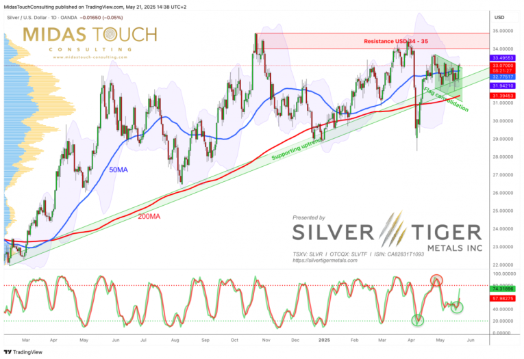 The sideways consolidation since then appeared erratic and deceptive but retained clearly an underlying bullish tone. Following a robust upward surge on Tuesday, May 20th, 2025, silver appears to be breaking out of its sideways consolidation, which has formed a flag pattern. Although silver might briefly retest its rising 200-day moving average at USD 31.39 for support, the trajectory now points toward higher resistance levels. Additionally, at USD 31.89, the lower Bollinger Band and the steadfast uptrend line from February 2024 offer further support, reinforcing the bullish outlook.