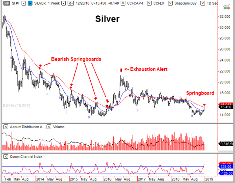 Silver’s monthly TD Sequential 9 Buy Setup in October (nine consecutive closes below four months earlier) has now been followed by an upside breakout on the daily and weekly charts.