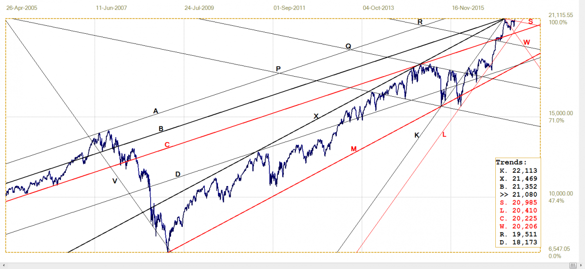 The steep decline two weeks ago as a consequence of White House rumours, at first had the DJIA testing resistance at line S (20 985) and last week with a minor break higher also above 21 000. The DJIA remains vulnerable while this break holds just marginally above line S, as it is doing. However, the decisive moment will be when support at the bottom of bull channel KL (20 410) is tested.