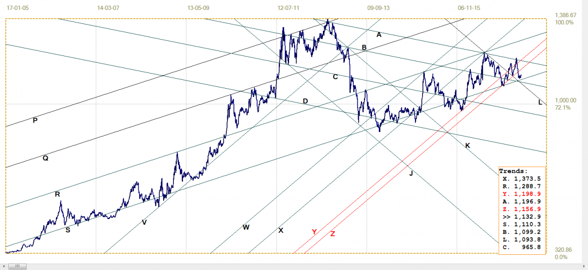While the euro and the price of gold moved in different directions two weeks ago, at least from the perspective of the euro price of gold, the euro price held mostly sideways in a tight range. A steady to stronger gold price last week performed better against the US dollar than the euro had managed to do and this had a positive effect on the euro price of gold. The price has opened up the gap to the key support at line S (€1110), but has quite a way to go before it will reach the resistance at the bottom of bull channel YZ (€1156).