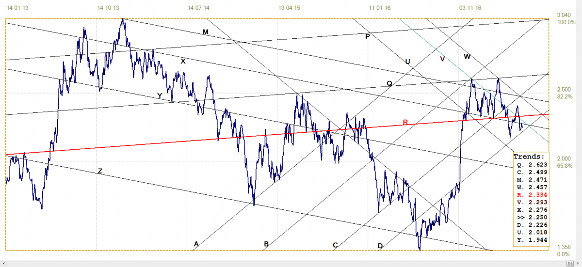 The fact that a price for crude above the $50 dollar level – represented by line X – is where shale producers apparently see an opportunity for a positive cash flow to reduce their difficult financial position, implies a reason for the two year ceiling in the price for crude. On the other hand, a price approaching the support at line Y prompts shale producers to reduce the number of active wells; production declines and this has a positive effect on the price of crude.