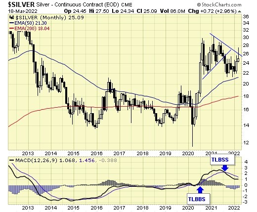Silver is on a long term SELL signal, but prices have found support at the 50ema.