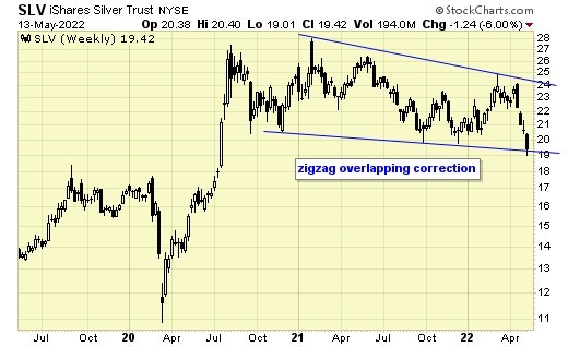 The zigzag overlapping price pattern is corrective, and when it completes, we should see a new bull leg up to new highs.