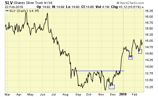 Silver has confirmed a bottom, with higher highs and higher lows, definition of an up trend.