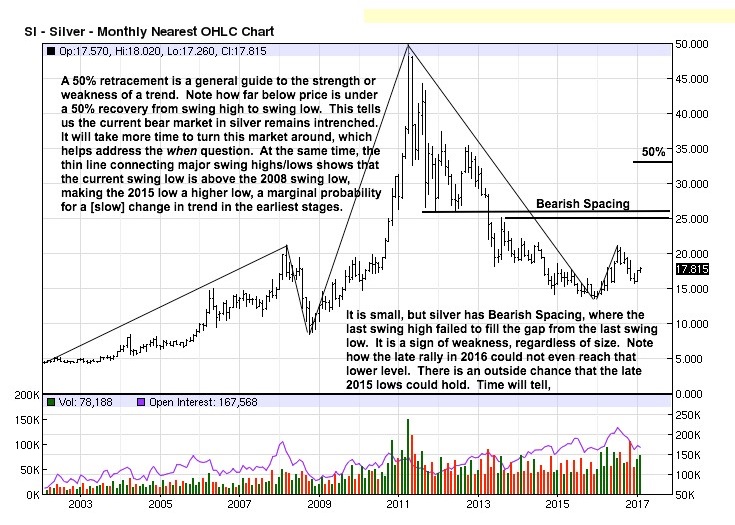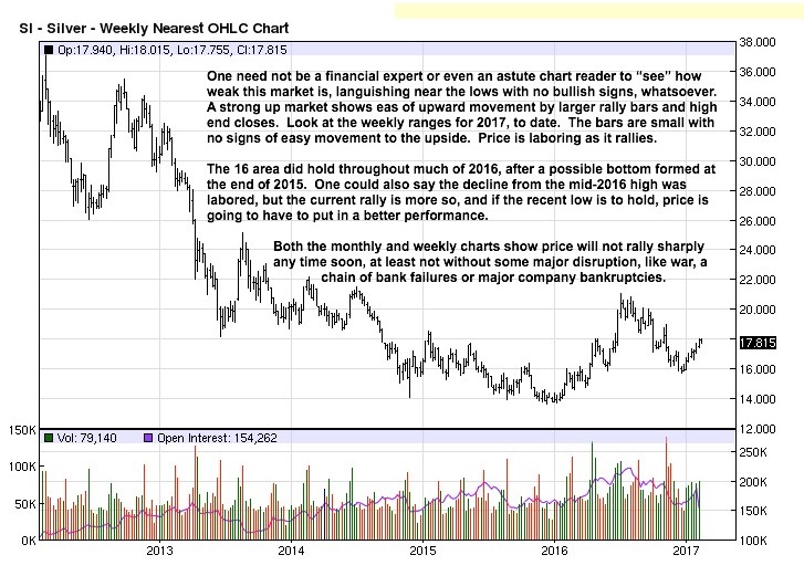 The single most question many people ask or want to know is where will silver be in a week or month and when? We gave up asking that question over three years ago after realizing that 2014's movement in silver would not be much different than 2013. Consequently, we repeated this observation for 2015 and 2016. It is now 2017. The number of forecasters/market experts that were calling for considerably higher prices during those years was legion. Nonetheless, silver remains closer to its recent bottom without having made a sustained rally to those widely anticipated much higher levels.