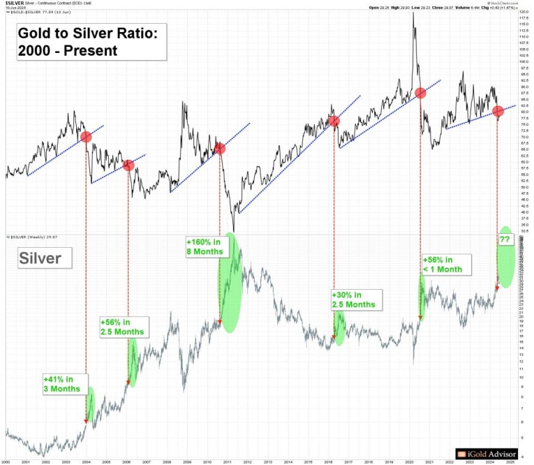 - In August 2010, the ratio again broke lower through a rising trend which began in March of 2008 à the result was that silver surged by an incredible 160%, from under $19 to nearly $50 per ounce, in approximately eight months.