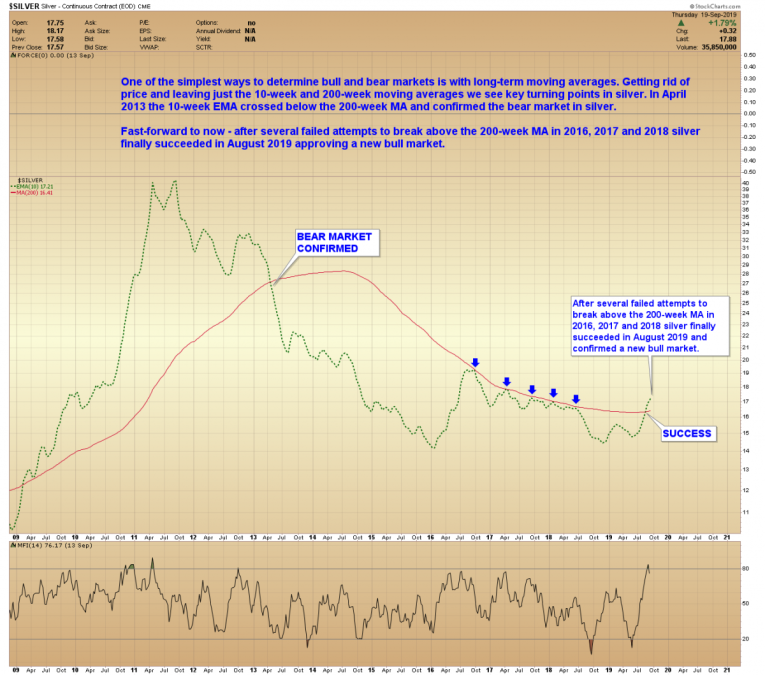One of the simplest ways to determine bull and bear markets is with long-term moving averages. Getting rid of price and leaving just the 10-week and 200-week moving averages we see key turning points in silver. In April 2013 the 10-week EMA crossed below the 200-week MA and confirmed the bear market in silver.