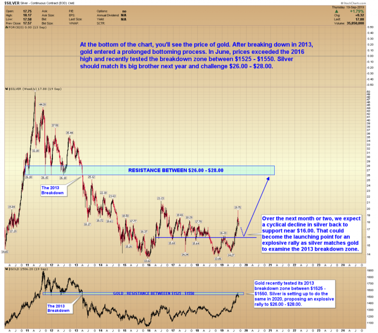 Over the next month or two, we expect a cyclical decline in silver back to support near $16.00. That could become the launching point for an explosive rally as silver matches gold to examine the 2013 breakdown zone.