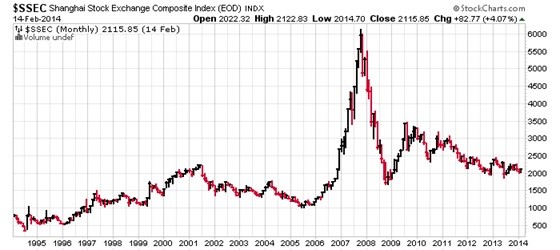 Investment alternatives for Chinese savers is today severely limited. In past years real estate did well, but has subsequently reached the Bubble Bursting stage. Moreover, interest paid on bank deposits for most of the proletariat (working-class) has been miserly at best (earning a meager 2.5% to 3.0% in recent years). And for the more sophisticated affluent classes, there is the Shanghai Stock Exchange (SSEC). But whereas the SSEC provided a respectable yearly return from 1995-2007, it has since fallen on severely hard times…as this chart clearly shows: