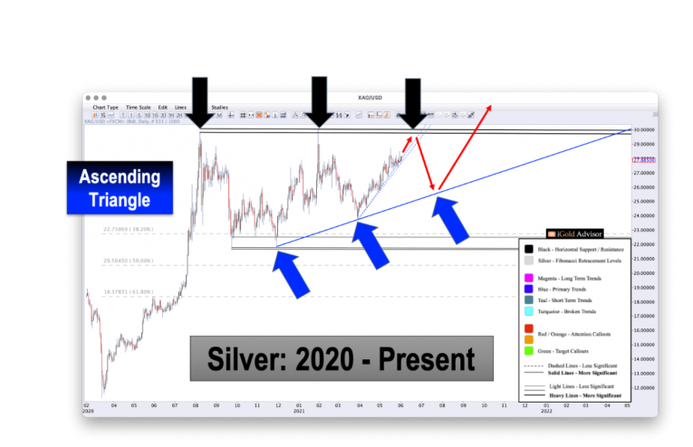 Ascending triangles tend to resolve between 2/3 to 3/4 of the time from the first peak to the apex of the triangle. As this consolidation began in August 2020 and has an apex in May 2022, we project in a highest probability that silver will break out between October – November of 2021.