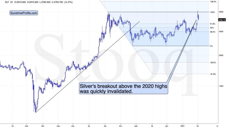 Silver invalidated the breakout above the 2020 highs. During today’s trading, silver is already down quite visibly. It’s now apparent that the silver world is not ending, and that silver’s price doesn’t have to keep on climbing. Is the silver shortage here? Not necessarily. Some bullion products might be in short supply and it wouldn’t be the first time this is the case. The size of the silver market is not that small after all.