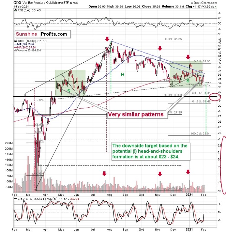 Interestingly, the most recent move higher only made the similarity of this shoulder portion of the bearish head-and-shoulders pattern to the left shoulder (figure 2 - both marked with green) bigger. This means that when the GDX breaks below the neck level of the pattern in a decisive way, the implications are likely to be extremely bearish for the next several weeks or months.