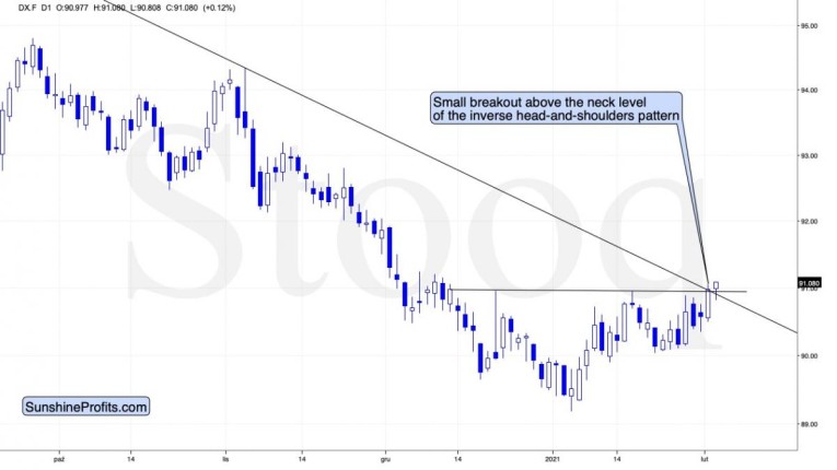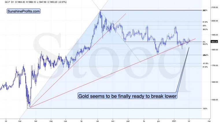 Please note that the thing that prevented gold from declining further right away, was the rising red support line based on the March 2020 and November 2020 lows. In all cases, when gold was about to break below this line, it ultimately moved slightly higher. Right now, gold is making another attempt to break below it. It seems quite likely that this attempt will be successful.