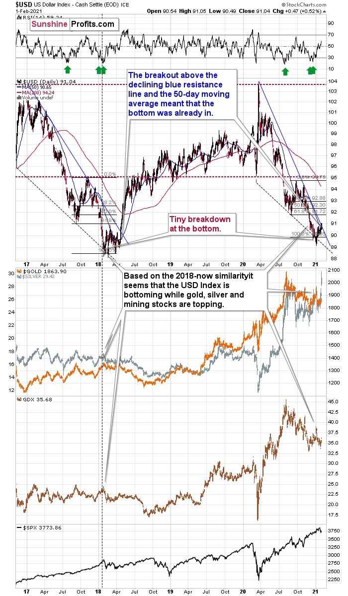 When we saw this kind of double breakout back in 2018, it meant that the bottoming process was complete and that one should buckle up for a sharp upswing. The implications are very bullish for the USD Index and very bearish for the precious metals sector.