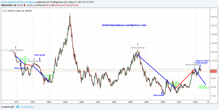 On the chart, I have marked two fractals (1 to 3). Both fractals exist in similar conditions – relative to the relevant Dow/Gold ratio peaks (1966 and 1999), as well as Dow peaks. Both fractals span over the period of the first phase of the silver bull market during the 70s and the current era (2001 to 2017), respectively.