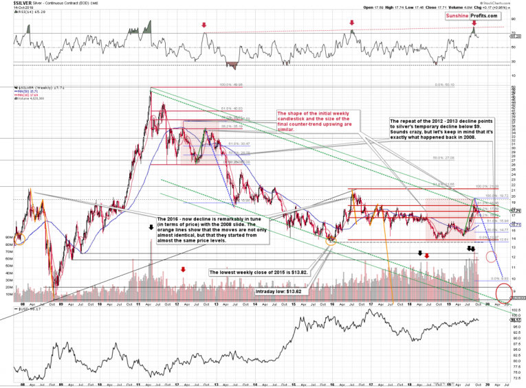 This level – the proximity of $20 – is more important than it appears at first sight. It served as resistance in late 2009, twice in early 2010, and silver accelerated its decline only after it broke through this barrier. This level then stopped the 2013 decline (twice) and it served as support in early 2014. Silver tried to break above this level in 2016, but it failed and invalidated the breakout shortly. Decline followed and higher prices have not been seen since that time. The final attempt to break above this level took place this year. And silver failed once again.