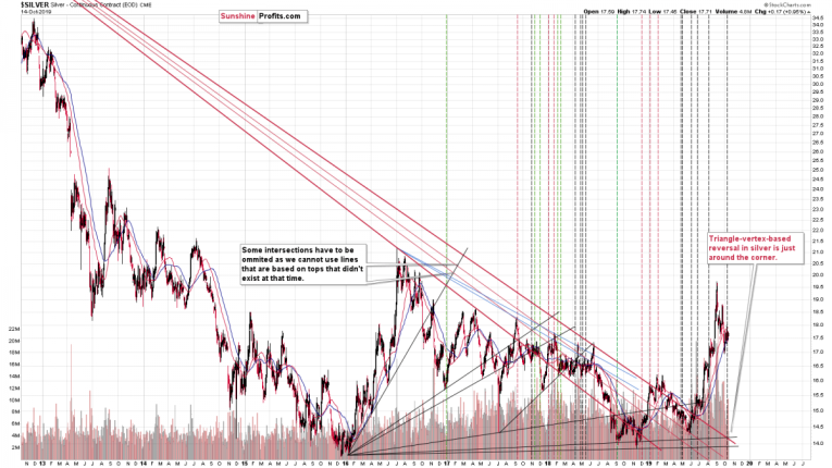 Whenever a rising support line and a declining resistance line cross, a price extreme is often formed. Silver’s recent reversal took place almost right at such a crossroad, just as we warned in advance. What does it mean going forward? It means that the odds are that the counter-trend rally in silver that we saw recently is most likely over.