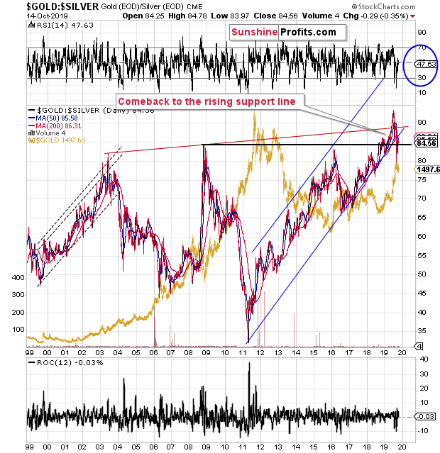 In a way, the decline in the ratio confirmed our earlier analysis. We’ve been emphasizing that the main trend in the ratio is up, which is yet another reason to think that the major trend in the precious metals sector remains down. Now, the fact that both metals moved higher while the ratio moved lower is a confirmation of the general tendency for the metals and ratio to move in the opposite directions.