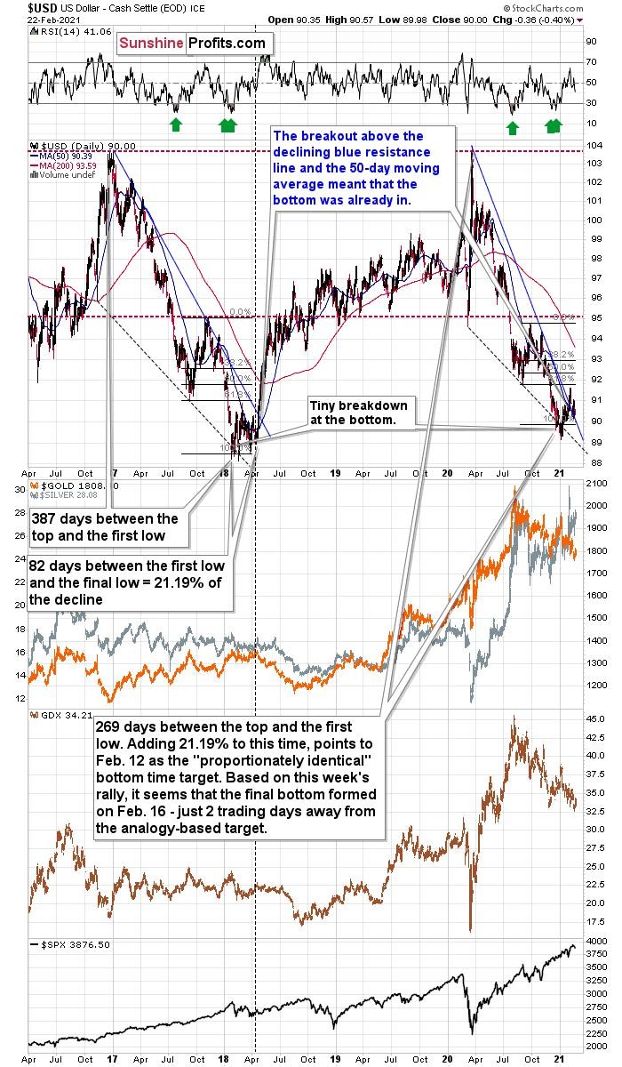 In short, it didn’t. The decline is still a part of the verification of the breakout above the declining medium-term resistance line that I marked with blue (figure 4). Based on the obvious similarity to early 2018, the verification of the breakdown is likely the final step before a major rally in the USDX. This will likely translate into lower precious metals and mining stock prices, especially if the general stock market declines as well.