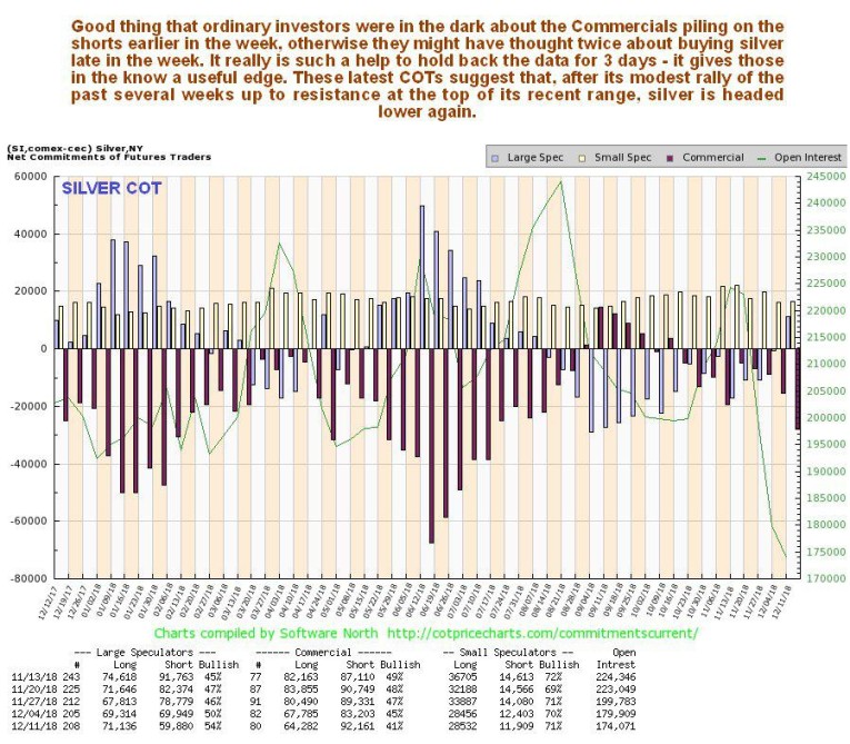 Anyone privy to the latest COT data ahead of the crowd, who get it 3 days later after it has been bounced off a satellite orbiting Uranus, would have known that silver would drop back from the resistance at the top of the range again, because over the past 2 weeks, and especially the past week, the Commercials piled on the shorts again, as we can see on the latest chart below. Silver’s COTs had been supportive, but have deteriorated significantly over the past several weeks, opening up downside risk again.