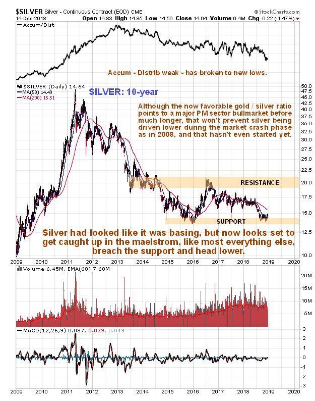 Silver’s long-term 10-year chart now looks weak, with it looking set to crash the support at the late 2015 – early 2016 lows, which it has been perched just above for the past several months, and head lower, perhaps as low as about $10, which we would expect to occur against the background of a widespread heavy selloff across the commodity sector and stockmarkets. Needless to say, if it winds up at such a silly level, it will be a very strong buy. The falling 200-day moving average is bearing down on the price from above and the Accumulation line is weak, having recently broken to new lows.