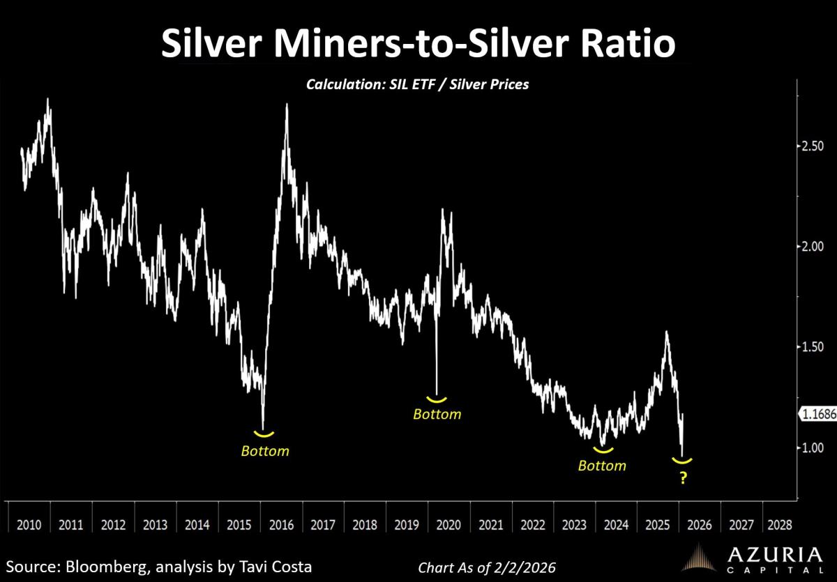 Below is a great chart from Tavi Costa: The silver miners (SIL) to silver (SLV) ratio is near one of the lowest levels in history. Not long ago, investors were simply hoping to see silver trade above $50/oz. Today, prices are well beyond that level, while some producers are operating at sub-$15/oz costs. Take away: silver miners are still a bargain and could have a lot more upside going forward.