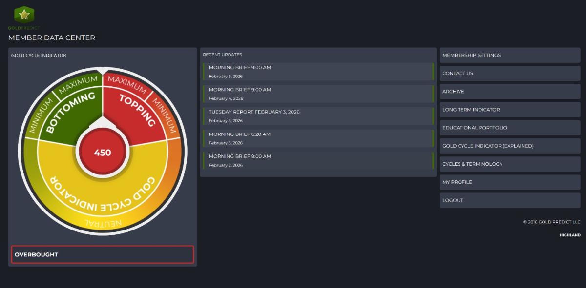 Our Gold Cycle Indicator remains overbought at 450.