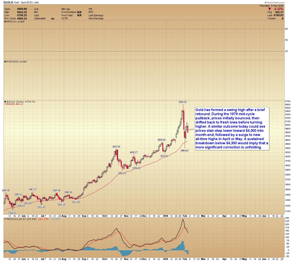 GOLD: Gold has formed a swing high after a brief rebound. During the 1979 mid-cycle pullback, prices initially bounced, then drifted back to fresh lows before turning higher. A similar outcome today could see prices stair-step lower toward $4,300 into month-end, followed by a surge to new all-time highs in April or May. A sustained breakdown below $4,300 would imply that a more significant correction is unfolding.
