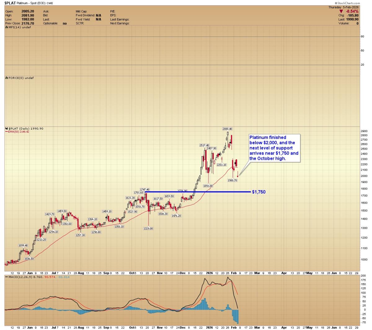 PLATINUM: Platinum finished below $2,000, and the next level of support arrives near $1,750 and the October high.