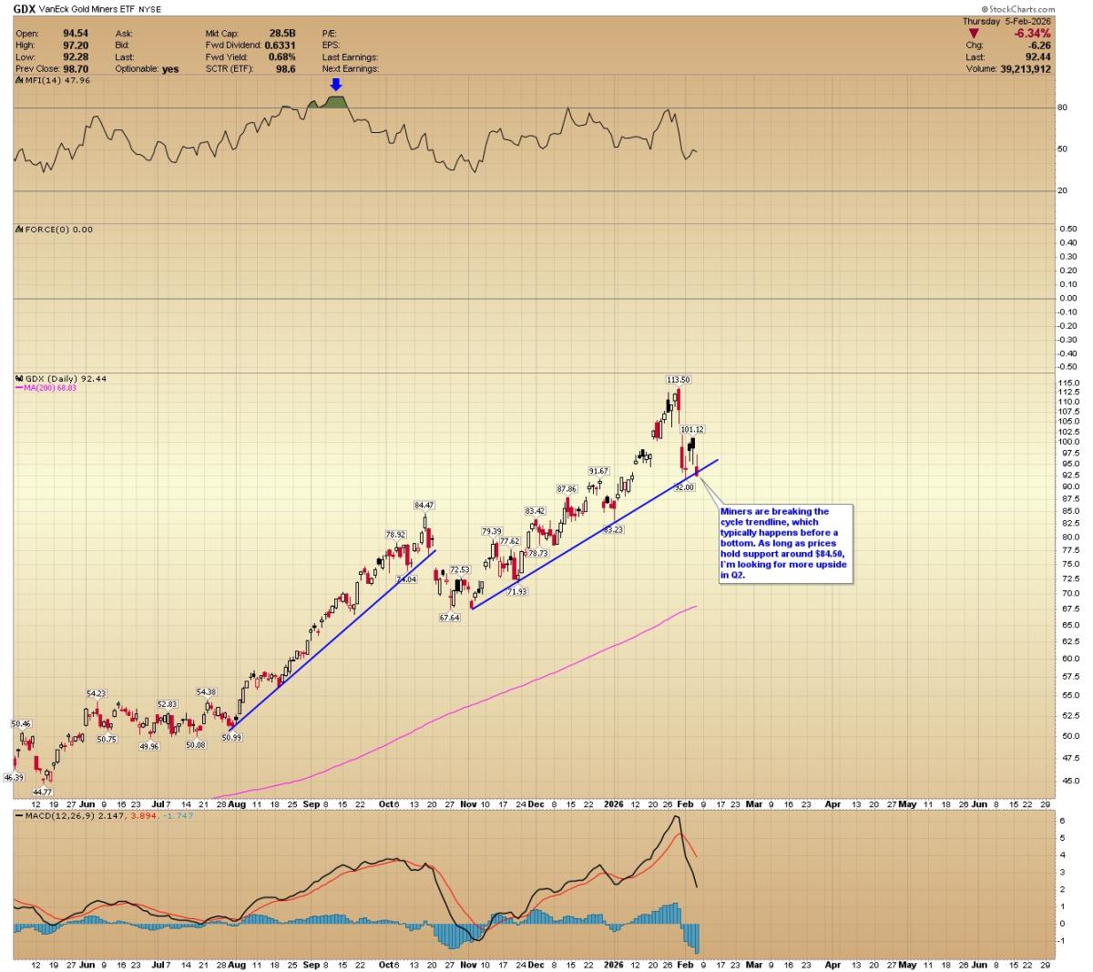 GDX: Miners are breaking the cycle trendline, which typically happens before a bottom. As long as prices hold support around $84.50, I'm looking for more upside in Q2.