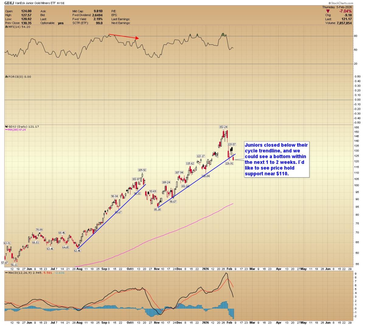 GDXJ: Juniors closed below their cycle trendline, and we could see a bottom within the next 1 to 2 weeks. I'd like to see price hold support near $110.