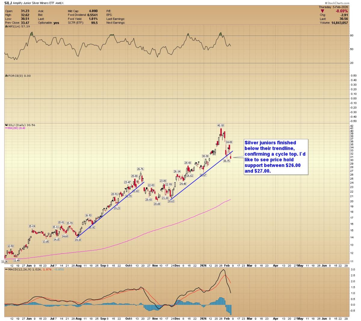 SILJ: Silver juniors finished below their trendline, confirming a cycle top. I'd like to see price hold support between $26.00 and $27.00.