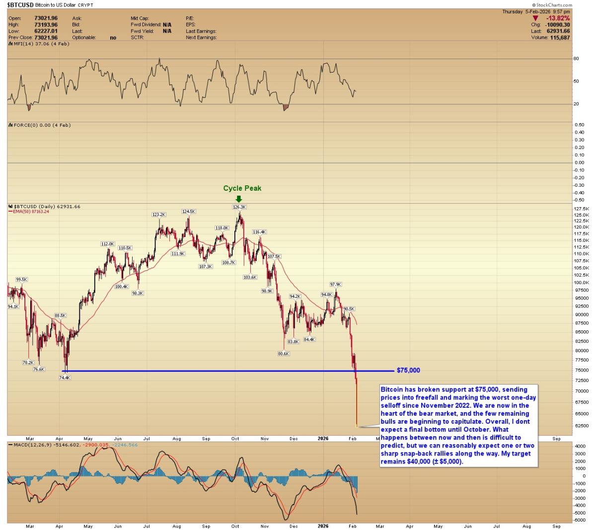 BITCOIN: Bitcoin has broken support at $75,000, sending prices into freefall and marking the worst one-day selloff since November 2022. We are now in the heart of the bear market, and the few remaining bulls are beginning to capitulate. Overall, I don’t expect a final bottom until October. What happens between now and then is difficult to predict, but we can reasonably expect one or two sharp snap-back rallies along the way. My target remains $40,000 (± $5,000).