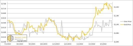 Gold went down (as the muggles would measure it in dollars). It dropped almost 40 bucks. Silver fell almost 60 cents. Since the silver price fell proportionally farther than gold, the gold-silver ratio went up.