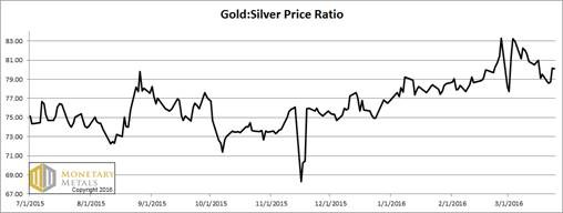 Next, this is a graph of the gold price measured in silver, otherwise known as the gold to silver ratio. The ratio was up this week.