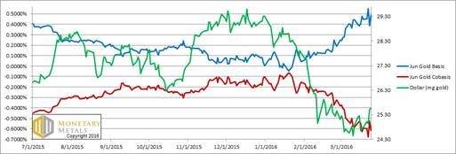 The green line is the price of the dollar, measured in gold terms (i.e. the inverse of the price of gold). The red line is the gold cobasis, our measure of scarcity of the metal. For many weeks, as it fell (i.e. the gold price rose) gold became less scarce. And when it rose, gold became scarcer. There was an almost uncanny tracking of these two lines (which is less pronounced in the June contract).