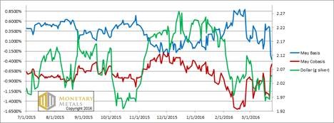 For each metal, we will look at a graph of the basis and cobasis overlaid with the price of the dollar in terms of the respective metal. It will make it easier to provide brief commentary. The dollar will be represented in green, the basis in blue and cobasis in red.