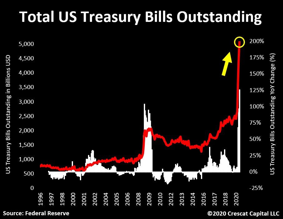 So, there is no end in sight for the currency debasement that is taking place. Compounding matters, 71% of the government debt issued this past year matures in less than 12 months and the amount of Treasury Bills outstanding shot up to $5 trillion recently.