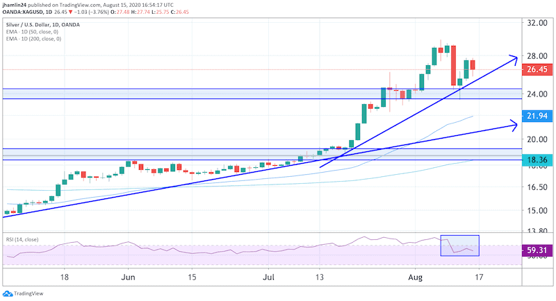 The short-term chart shows the recent pullback to support around $24 and a small bounce. We think there are decent odds of this support holding. But if it fails, the next key support zone is between the trend line at $21 and the 50-day EMA around $22. This $21-$22 zone is stronger technical support for silver with a high likelihood of holding.